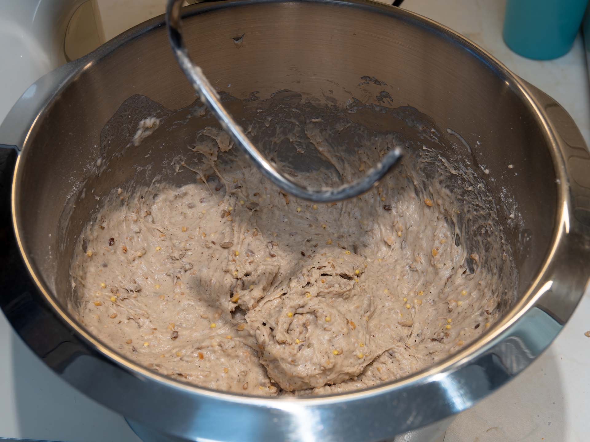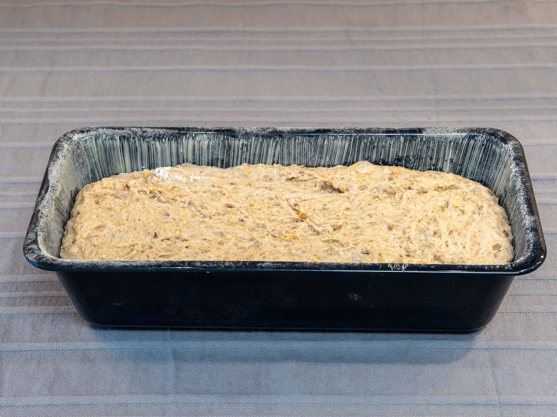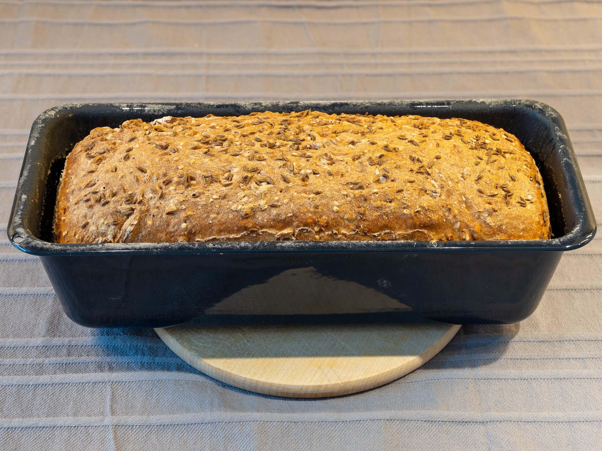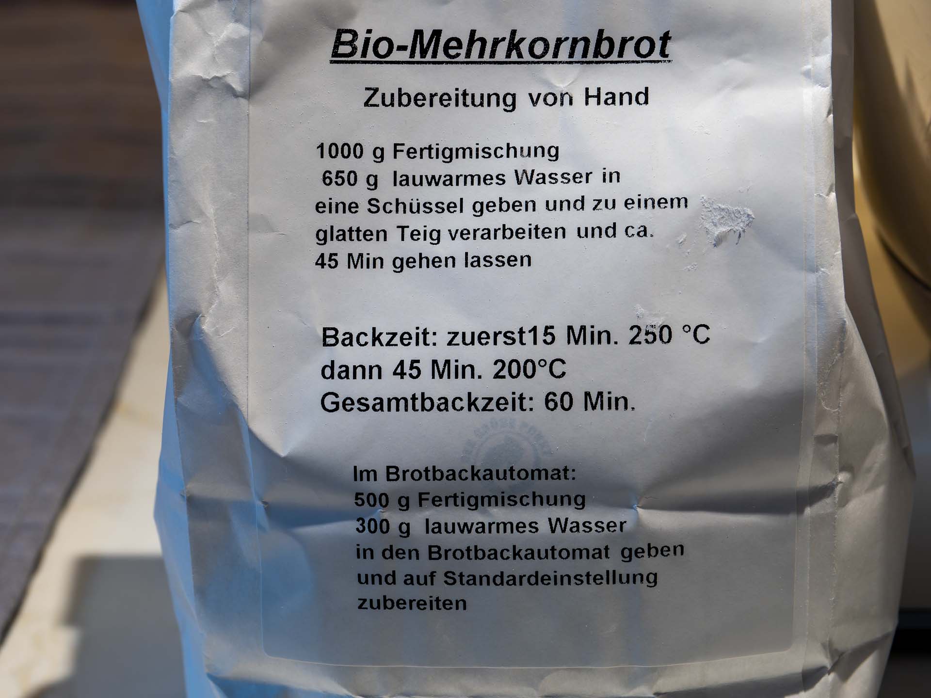 zurück -Brotbacken- Bio-Mehrkornbrot Küchenmaschine zum Teig rühren Zusätzlich Salz nach Bedarf Salz Brotgewürz Kümmel, damit das Brot bekömmlicher wird Alle Zutaten gründlich mischen Nach Zugabe von Wasser den Teig zirka 5- 10 Minuten rühren, bis ein glatter Teig entsteht Den fertigen Teig in Schüssel umfüllen Kastenform 25x13x7,5 cm emailliert Kastenform einfetten und mit etwas Mehl bestäuben Backofen auf 30° einstellen Teig 45 Minuten im Backofen gehen lassen Teig im Backofen bei 30° Nach 45 Minuten ist der Teig gut gegangen Jetzt kann der Teig in die Kastenform umgefüllt werden Das Brot im vorgeheizten Backofen bei 250° 7 1/2 Minuten Backen dann weitere 30 Minute bei 200° fertigbacken Brot bei 200° im Backofen Brot abkühlen lassen Fertiges Brot Fertiges Brot Fertiges Brot…lecker…