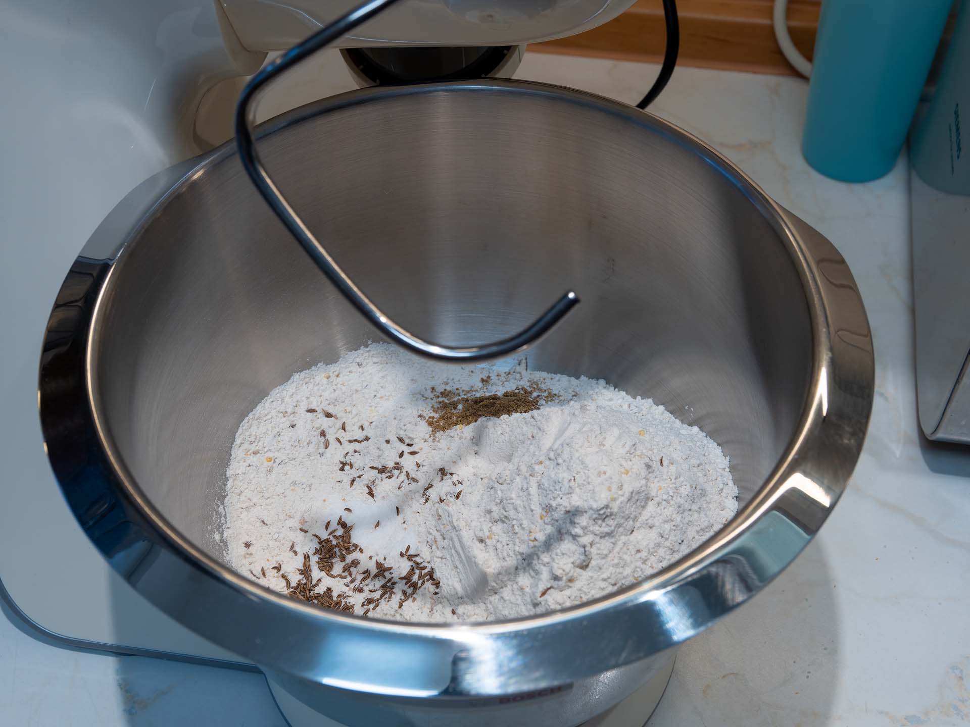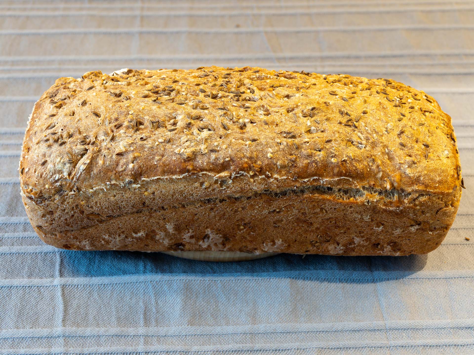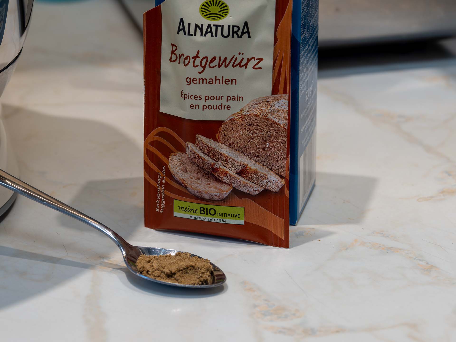 zurück -Brotbacken- Bio-Mehrkornbrot Küchenmaschine zum Teig rühren Zusätzlich Salz nach Bedarf Salz Brotgewürz Kümmel, damit das Brot bekömmlicher wird Alle Zutaten gründlich mischen Nach Zugabe von Wasser den Teig zirka 5- 10 Minuten rühren, bis ein glatter Teig entsteht Den fertigen Teig in Schüssel umfüllen Kastenform 25x13x7,5 cm emailliert Kastenform einfetten und mit etwas Mehl bestäuben Backofen auf 30° einstellen Teig 45 Minuten im Backofen gehen lassen Teig im Backofen bei 30° Nach 45 Minuten ist der Teig gut gegangen Jetzt kann der Teig in die Kastenform umgefüllt werden Das Brot im vorgeheizten Backofen bei 250° 7 1/2 Minuten Backen dann weitere 30 Minute bei 200° fertigbacken Brot bei 200° im Backofen Brot abkühlen lassen Fertiges Brot Fertiges Brot Fertiges Brot…lecker…
