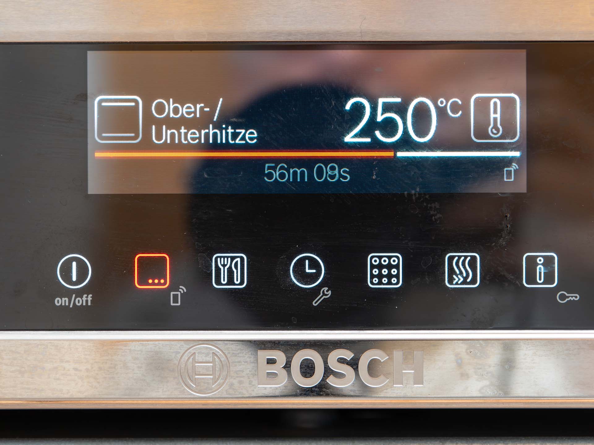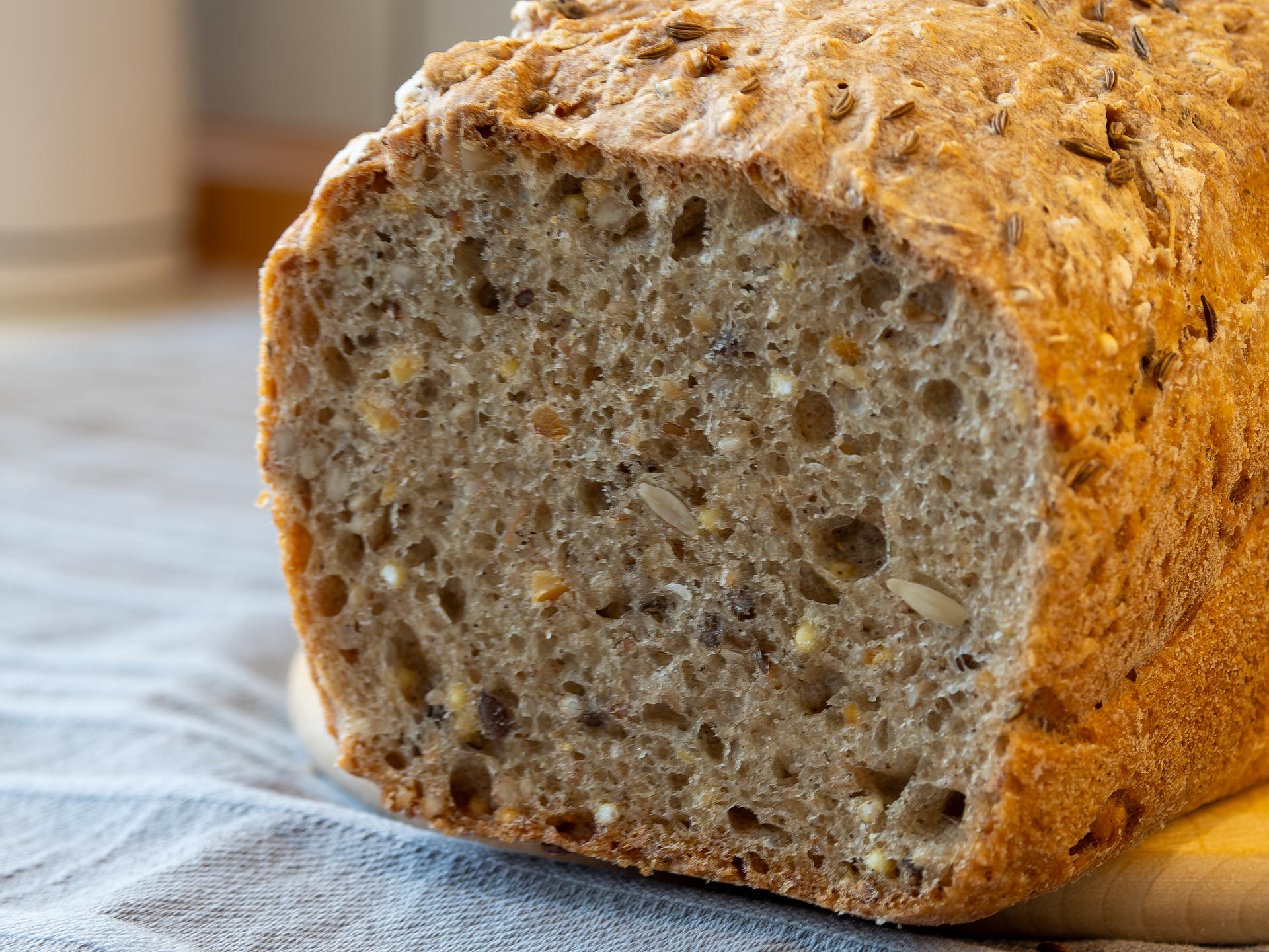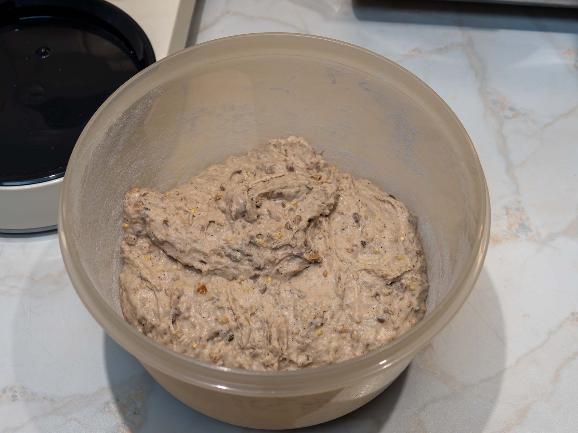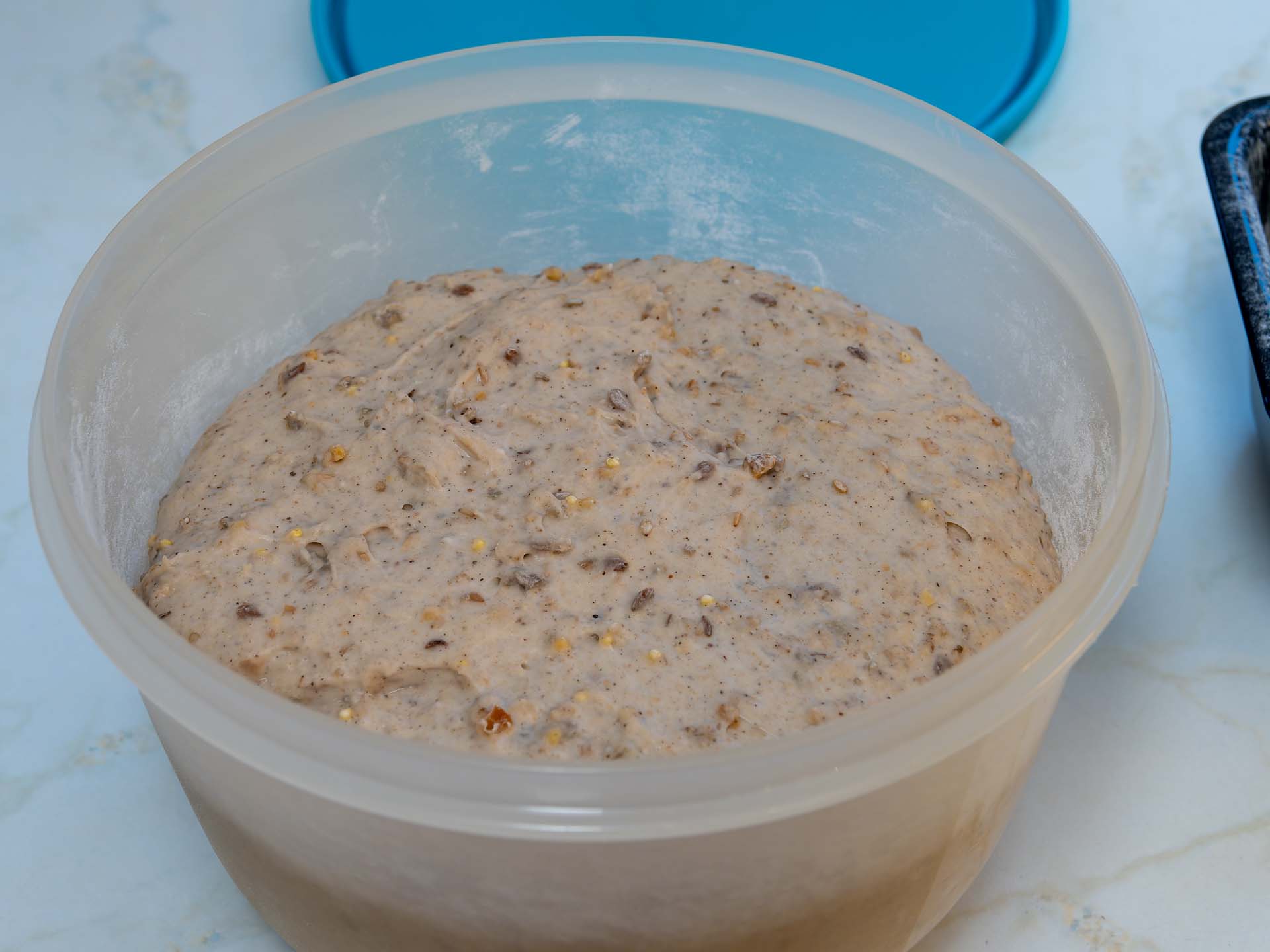 zurück -Brotbacken- Bio-Mehrkornbrot Küchenmaschine zum Teig rühren Zusätzlich Salz nach Bedarf Salz Brotgewürz Kümmel, damit das Brot bekömmlicher wird Alle Zutaten gründlich mischen Nach Zugabe von Wasser den Teig zirka 5- 10 Minuten rühren, bis ein glatter Teig entsteht Den fertigen Teig in Schüssel umfüllen Kastenform 25x13x7,5 cm emailliert Kastenform einfetten und mit etwas Mehl bestäuben Backofen auf 30° einstellen Teig 45 Minuten im Backofen gehen lassen Teig im Backofen bei 30° Nach 45 Minuten ist der Teig gut gegangen Jetzt kann der Teig in die Kastenform umgefüllt werden Das Brot im vorgeheizten Backofen bei 250° 7 1/2 Minuten Backen dann weitere 30 Minute bei 200° fertigbacken Brot bei 200° im Backofen Brot abkühlen lassen Fertiges Brot Fertiges Brot Fertiges Brot…lecker…